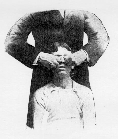 left hand on his forehead, and with the right hand place the thumb