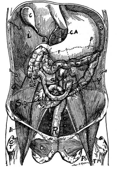 walls. Observe that the relaxed abdominal walls pass sufficiently distalward