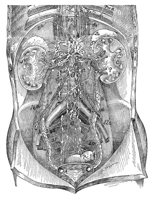 chain of ganglia; 14 and 15, dilated ureters wrapped by nerve plexuses;