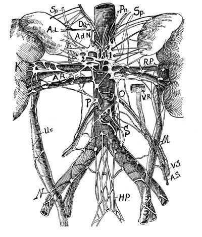 spermatic ganglia; 11 inferior mesenteric ganglia; 12 and 13 lumbar lateral