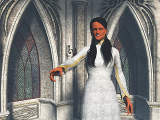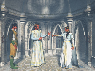 In the visual portrayal of Ameene, I have created three images to represent the three major phases of that lifetime. In the first, she is a priestess within the Law of One. The second image has her in the temple of the Belials exalting in the sensuality of that environment. With the first period of geophysical upheaval caused by the Belials, she reverts back to the Law of One. In this third image the "combative" nature of her personality is again evident as she berates one of her associates.
